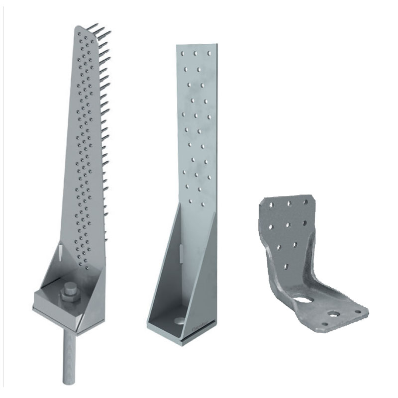 The shearing agnle has proven itself as a reliable connecting element for absorbing shear forces in timber frame and solid wood construction. When anchored in concrete, the shear bracket must be combined with the pressure plate so that the forces occurring are optimally transferred to the wood and the fatigue strength of the connection is increased. The special arrangement of the holes enables a force-fit connection using screws and nails.