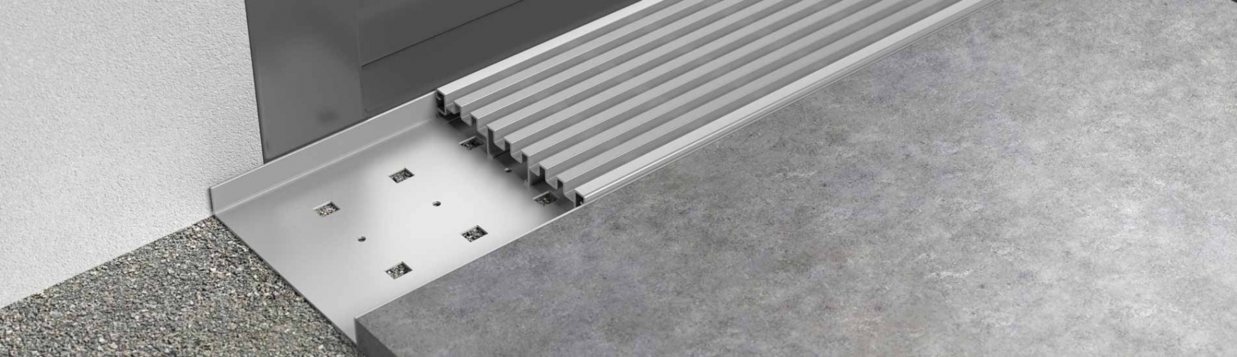 Thanks to the DrainTec Base, our DrainTec Drainage Grate can now also be used at ground level on gravel, sand and other substrates. Through the angular perforations in the middle of the base, the base can be combined with our adjustable support feet from the Pro-Line series. The Click Adapter 60 is required for this. By using an additional screw, the base can be fixed onto the adjustable support foot. The base can be used as part of standalone support and with aluminium substructures.