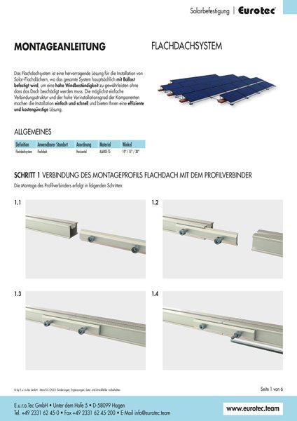 Flachdächer mit einer Neigung von max. 5° eignen sich ideal für eine Kombination aus Gründach und einer Solaranlage. Dabei ist die richtige Befestigung der Solarunterkonstruktion entscheidend, um die Stabilität und Sicherheit zu gewährleisten. Das moderne Montagesystem von Eurotec wurde speziell für Flachdächer konzipiert und ermöglicht eine einfache und zuverlässige Montage. Durch die Kombination aus dem Gründach und der Solaranlage wird die Dachfläche optimal genutzt.