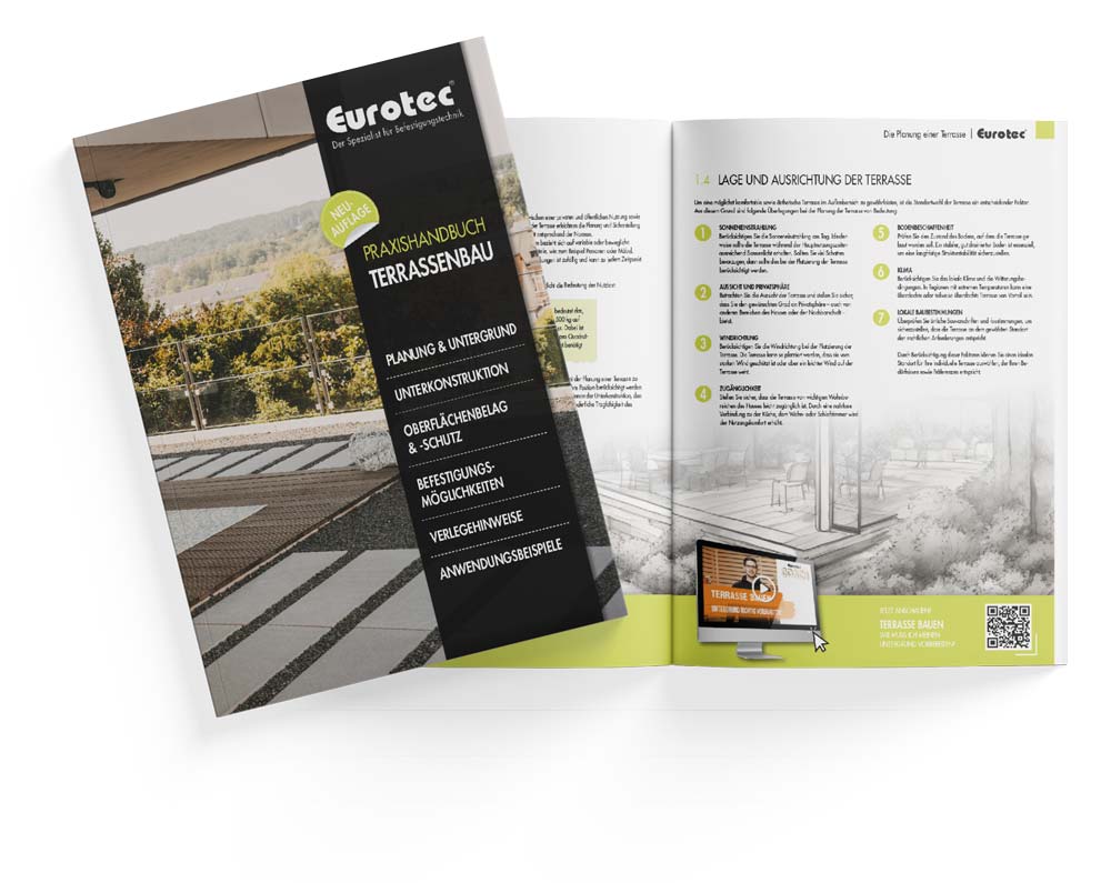 Ob Profi oder Heimwerker – mit dem Praxishandbuch von Eurotec werden Sie optimal unterstützt, um Ihre Terrasse sicher, langlebig und optisch ansprechend zu gestalten. Nutzen Sie das gebündelte Know-how und erleichtern Sie sich den Bauprozess!