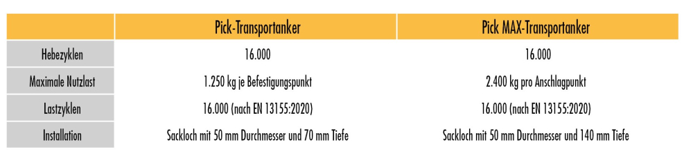 Der Pick-Transportanker kann eine Nutzlast von bis zu 1.250 kg tragen. Die Montage erfolgt mit wenigen Handgriffen, ohne dass eine Ausrichtung des Anschlagmittels erforderlich ist. Zudem bleibt die Sichtqualität der Oberflächen unbeschädigt, da keine Befestigungsschrauben notwendig sind. Der Pick-Transportanker zeichnet sich durch seine lange Lebensdauer aus und hält bis zu 16.000 Lastzyklen gemäß EN 13155:2020 aus.