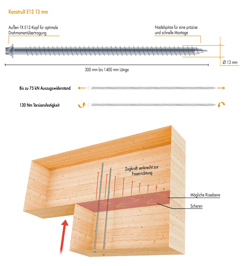 Inhalt: Tragfähigkeit & Planung von Holzbauschrauben | Merkmale & Leistung von Vollgewindeschrauben | KonstruX 13 mm E12 | Montagehinweise | ETA-Zertifizierung | Duktilität und Erdbebensicherheit | Fazit