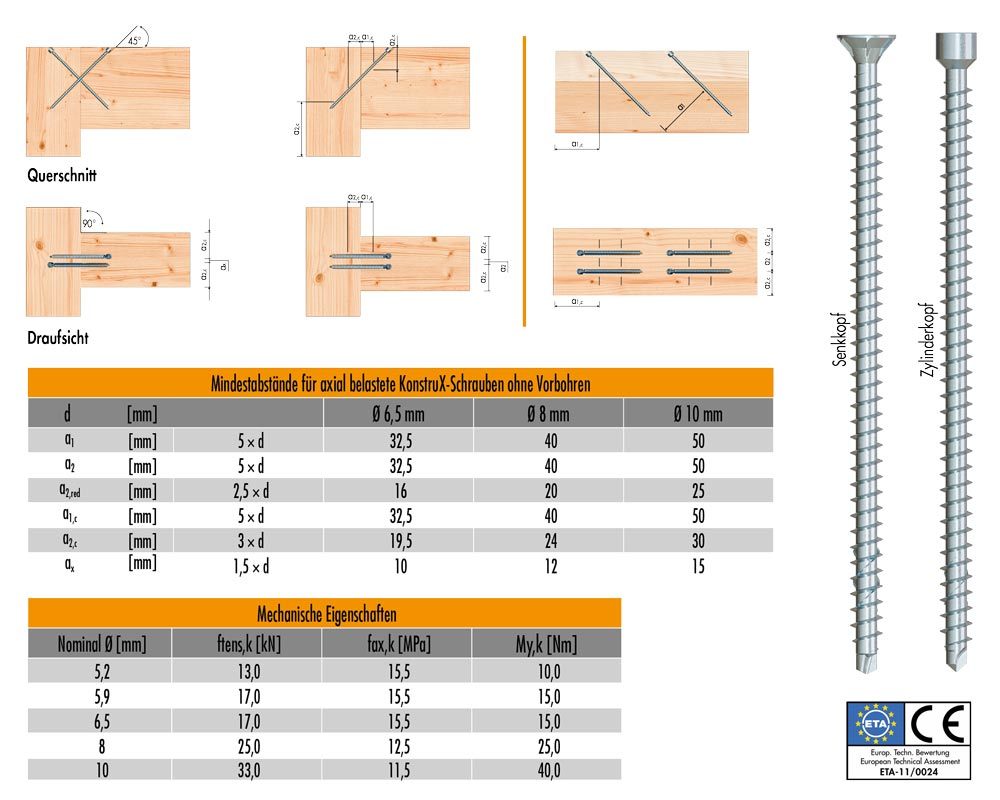 KonstruX Vollgewindeschrauben sind überwiegend mit einer Bohrspitze ausgestattet. Somit gelten ihre Abstandsregeln für EC-5 als vorgebohrt, auch wenn die Bauteile nicht vorgebohrt werden. Gemäß ETA-11/0024 können die Mindestabstände reduziert werden. Somit können mehr Schrauben auf kleiner Fläche verwendet werden, um eine höhere Tragfähigkeit zu erreichen.